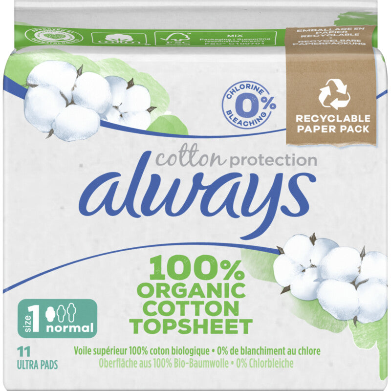 Always Cotton Protection Ultra Damenbinden haben eine Oberschicht aus 100 % Bio-Baumwolle.