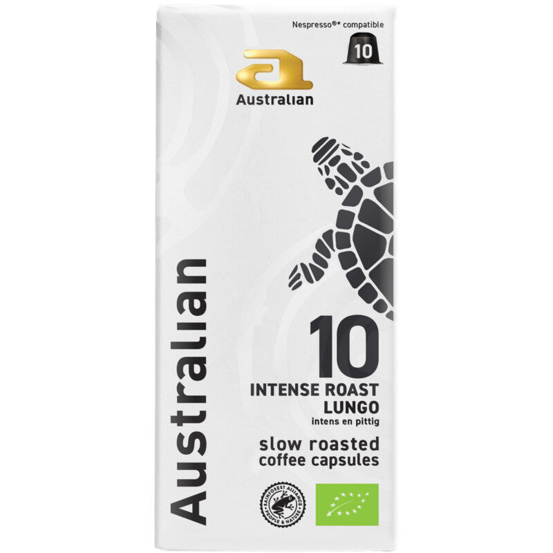 Onze Intense Roast is krachtig en heeft een karakteristieke smaak. De koffie heeft een volle body met een subtiele bitterheid en tonen van donkere chocolade. Geniet van een pittig koffie. Langzaam gebrand op smaak, met verbeterd receptuur Intensiteit 10/12 Biologisch en Rainforest Alliance gecertificeerd Aluminium capsules voor Nespresso koffiemachines Ontdek de pure smaak van Australian biologische koffie. De koffiebessen groeien op eigen kracht en zijn omringd door schaduwbomen, waardoor ze langer rijpen en minder kwetsbaar zijn. Onze meesterbrander brandt de koffie langzaam op lage temperatuur, waardoor alle verborgen smaken vrijkomen en resulteren in een krachtig aroma en complexe smaakbeleving.