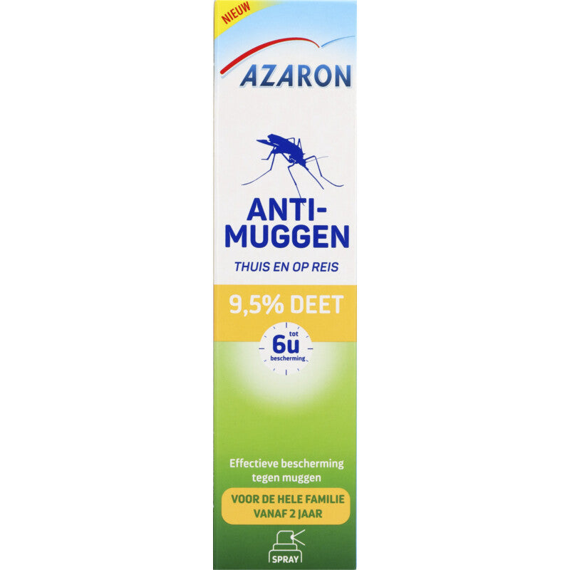 Azaron Anti-Mückenspray für Zuhause und auf Reisen mit 9,5 % DEET bietet bis zu 6 Stunden wirksamen Schutz gegen die häufigsten Mückenarten in den Niederlanden.
