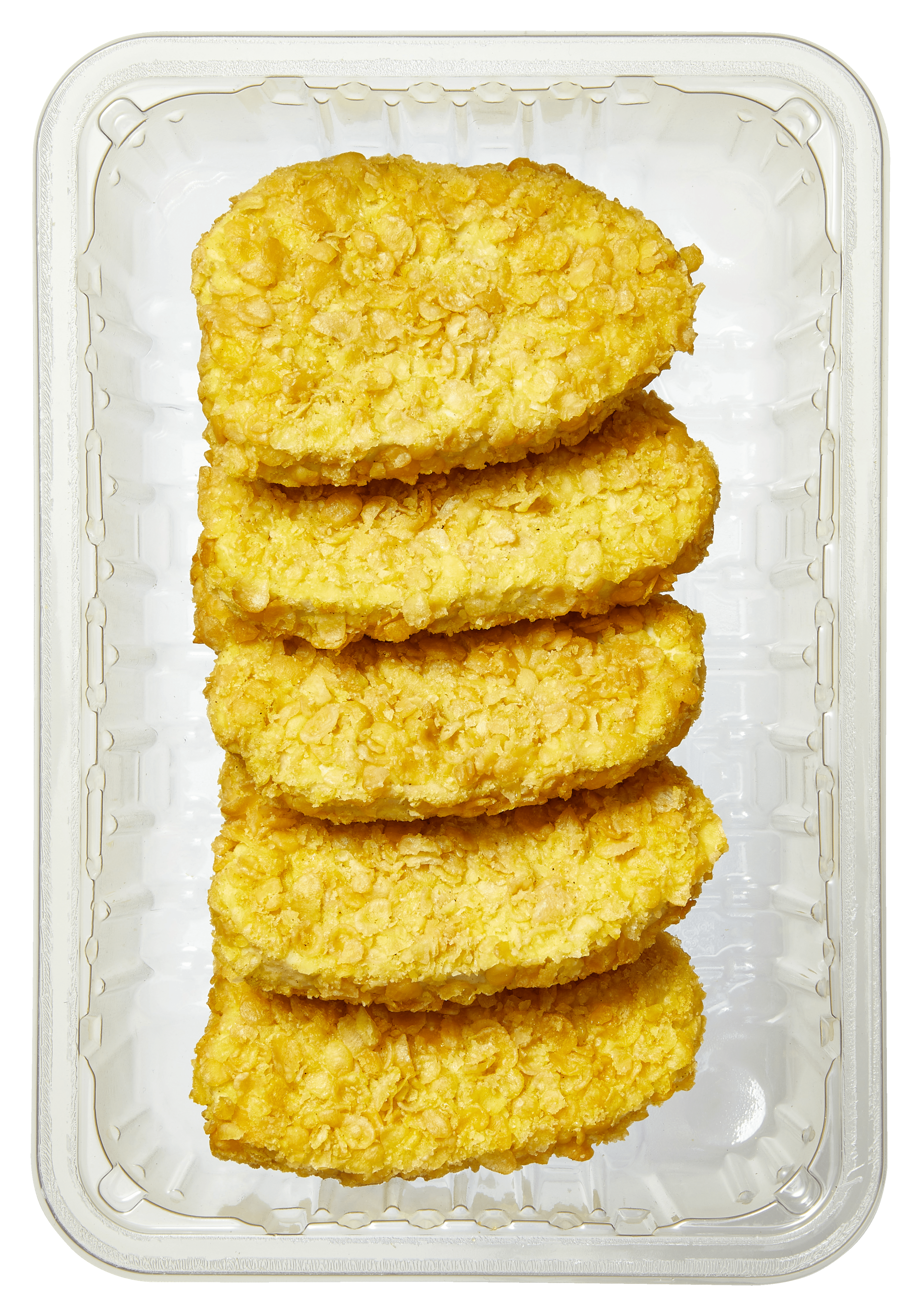 Kipschnitzel met cornflakes voorgegaard, ontdooid, met toegevoegd water samengesteld uit stukjes vlees