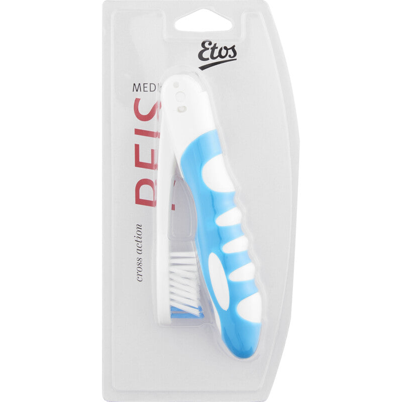 Praktisch für unterwegs! Die faltbare und kompakte Reisezahnbürste von Etos mit kreuzförmigen Borsten sorgt für eine gute Reinigung der Zahn- und Backenzahnoberflächen auf Reisen und im Urlaub.