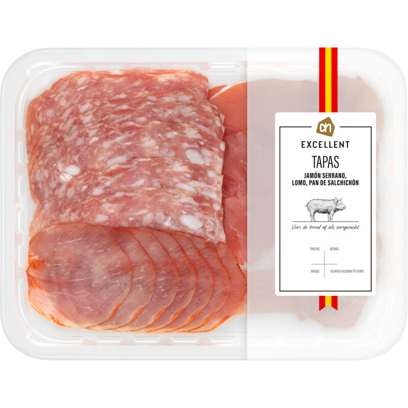 AH Excellent Tapas Varkensvleeswarenschotel met Serranoham GTS*, Varkenshaasfilet en Salami* Een heerlijke schotel met Spaanse vleeswaren, perfect voor bij de borrel of als voorgerecht De schotel bevat eiwitrijk varkensvlees, waaronder lomo en pan de salchichon Bewaar De schotel volgens De instructies op De verpakking Geniet van de smaakvolle combinatie van verschillende soorten vleeswaren.
