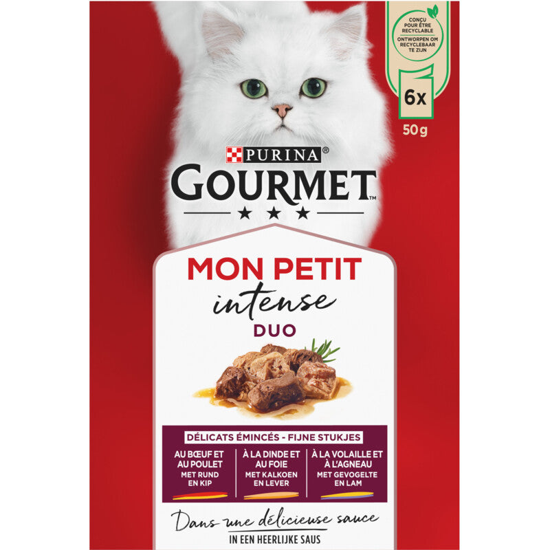 Gourmet-Mon-Petit-Feinstücke mit Rind und Huhn, Pute und Leber oder Geflügel und Lamm in einer köstlichen Sauce für ein hervorragendes Essen. *Keine zusätzlichen künstlichen Aromen und Konservierungsstoffe *Keine zusätzlichen Farbstoffe * Dieser Karton besteht zu mindestens 65 % aus recycelten Fasern *Dieser Karton ist recycelbar