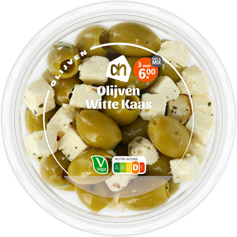 Frische, reichhaltige Olivenmischung auf Basis entkernter grüner Oliven, mariniert mit weißen Käsewürfeln, Kräutern und Gewürzen.