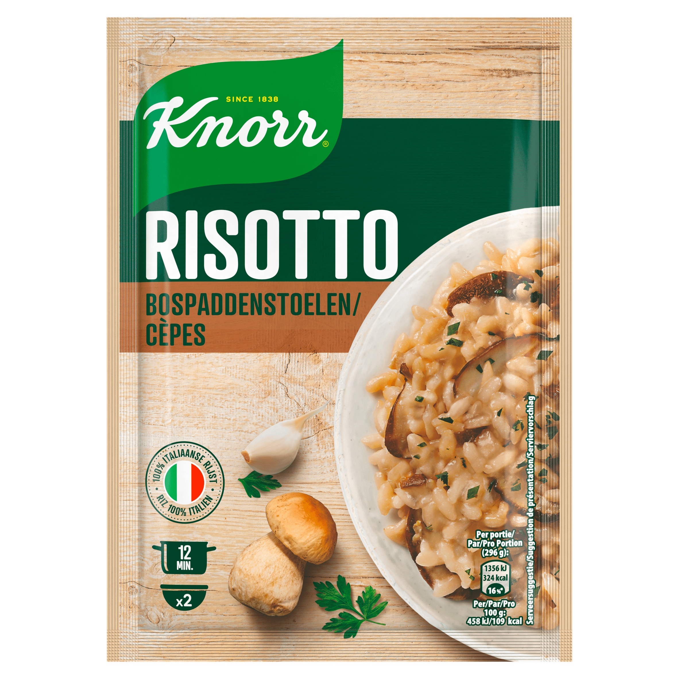 De Knorr Bospaddestoelen Risotto is rijk aan smaak. Met deze mix zet je thuis in een handomdraai een authentieke Italiaanse risotto op tafel, zonder uitgebreid te hoeven koken of te laten bezorgen. Knorr Bospaddestoelen Risotto is een gemakkelijk, heerlijk en veelzijdig risottogerecht op basis van 100% Italiaanse rijst. Deze maaltijd voor twee personen bereid je eenvoudig binnen 12 minuten met water in een pan.