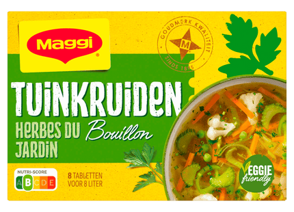 Deze verpakking Maggi bouillon is goed voor 8 liter bouillon