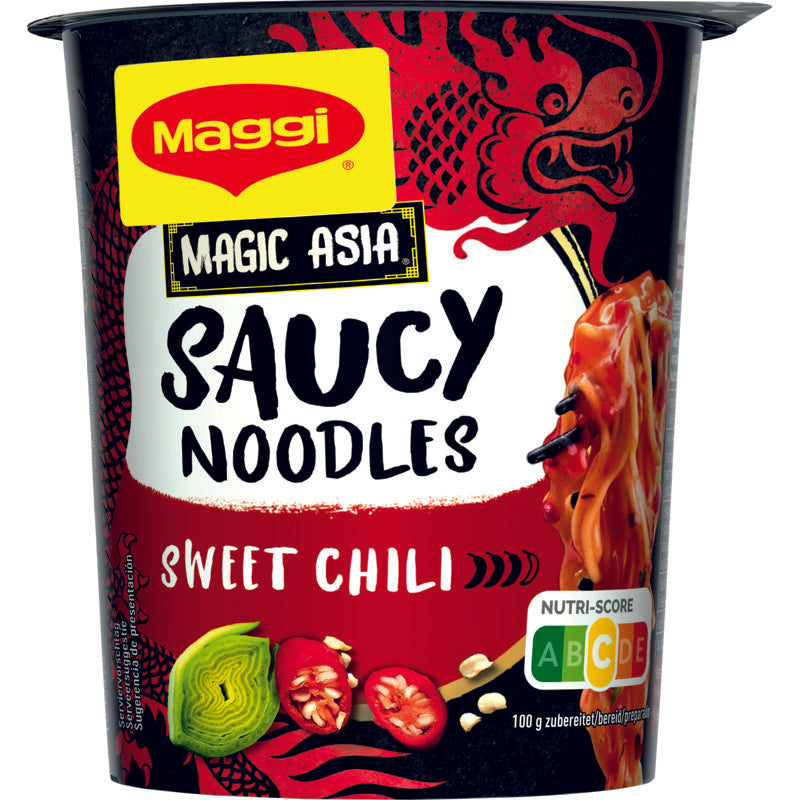 Maggi magic asia saucy noodles sweet Chili zijn heerlijke noedels met een Aziatische twist. Onweerstaanbaar en makkelijk te bereiden, perfect voor een drukke avond! Snelle en gemakkelijke Manier om te genieten van sweet Chili noedels Authentieke Aziatische kruiden voor heerlijke smaak Klaar in 4 minuten voor drukke avonden of lunches op het werk Ideaal als snack of als aanvulling op een maaltijd