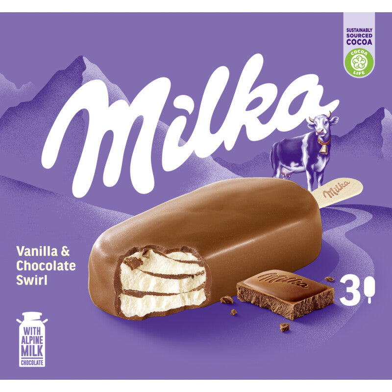 Delicaat milka-ijslollygenot voor het hele gezin. Romig vanille-ijs met een knapperige chocoladewerveling Omhuld met Milka alpenmelkchocolade
