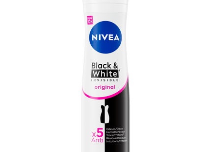 NIVEA Black & White Invisible biedt bescherming tegen witte vlekken op zwarte kleding en tegen gele vlekken op witte kleding dankzij de unieke gepatenteerde anti-vlekken technologie. Het is een betrouwbare 72 uur anti-transpirant bescherming, sterk tegen zweet en geurtjes, die je huid verzorgt. De huidtolerante formules zijn dermatologisch bewezen en bevatten geen ethylalcohol. NIVEA Black & White biedt een complete bescherming tegen zweet, geurtjes, vlekken, resten en irritaties, terwijl het zacht is voor de huid. Onze antitranspiratiemiddelen bieden Derma 72h Active bescherming: onze producten werken samen met de huid, voor een betrouwbare en sterke doeltreffendheid tegen zweet en geurtjes en met huidvriendelijke formules.