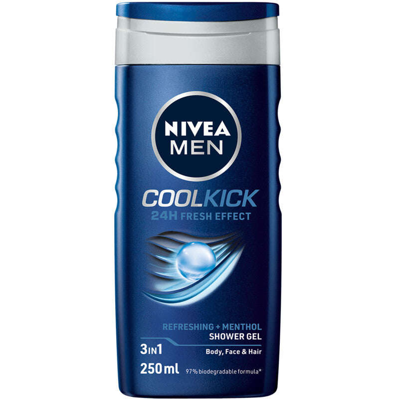 Ein 3-in-1-Duschgel für Gesicht, Körper und Haare von Männern: Nivea Cool Kick Duschgel. Verleiht sofort ein frisches Gefühl bei intensiver Pflege. * pH-hautneutral *Hautfreundlichkeit dermatologisch bestätigt * Zu 97 % biologisch abbaubare Formel * Flasche aus 97 % recyceltem Material