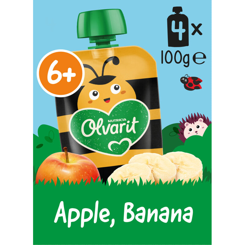 4er-Pack Olvarit Quetschfrucht Apfel Banane, geeignet für Babys ab 6 Monaten. Die Quetschbeutel sind vollgepackt mit Früchten und eignen sich ideal als lustiger, leckerer und verantwortungsvoller Snack! * Fruchtsnack aus reinen und natürlichen Zutaten * Enthält keinen zugesetzten Zucker, nur natürlich vorkommenden Zucker * Praktisch für unterwegs, wenn Sie beispielsweise einen Tag unterwegs sind * Babysnack, zubereitet mit Leidenschaft für gutes Essen und Sorge für den Planeten