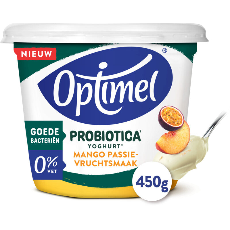 Ingrediënten: Magere YOGHURT met L. acidophilus, Bifidobacterium animalis subsp. lactis en L. rhamnosus Gorbach & Goldin, 2% vruchten (1,5% mango, 0,5% passievruchtsap), MELKEIWIT, gemodificeerd maïszetmeel, aroma, water, wortelconcentraat, zoetstof: sucralose; foliumzuur, vitamine B2, B6, B12 en D.
