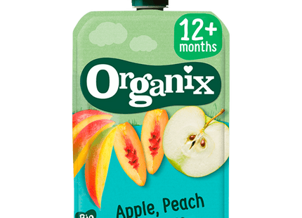 Organix Quetschfrüchte im praktischen Quetschbeutel für Babys ab 6 Monaten. Diese Babynahrung von Organix mit Apfel, Pfirsich und Mango ist ein idealer Fruchtsnack für zwischendurch.