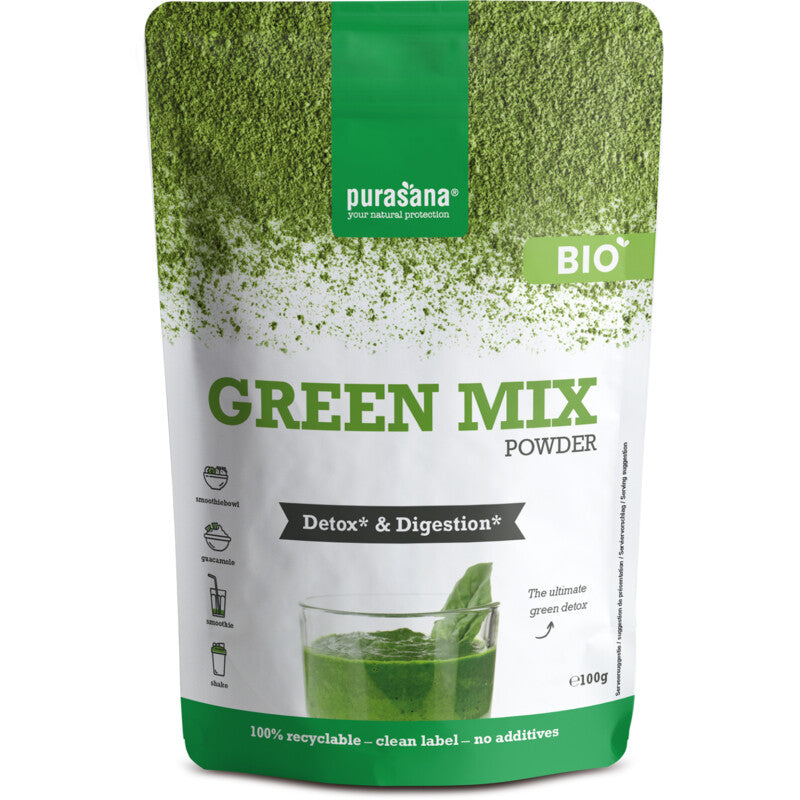 Poedermix op basis van plantenpoeders. Green mix is een mix van groene superfoods. Chlorella draagt bij aan de spijsvertering en het ontgiften van het lichaam.Biologisch, natuurlijk en plant-basedMix van chlorella, spirulina, tarwegras en gerstegrasGeen toegevoegde suikersBron van plantaardige eiwitten