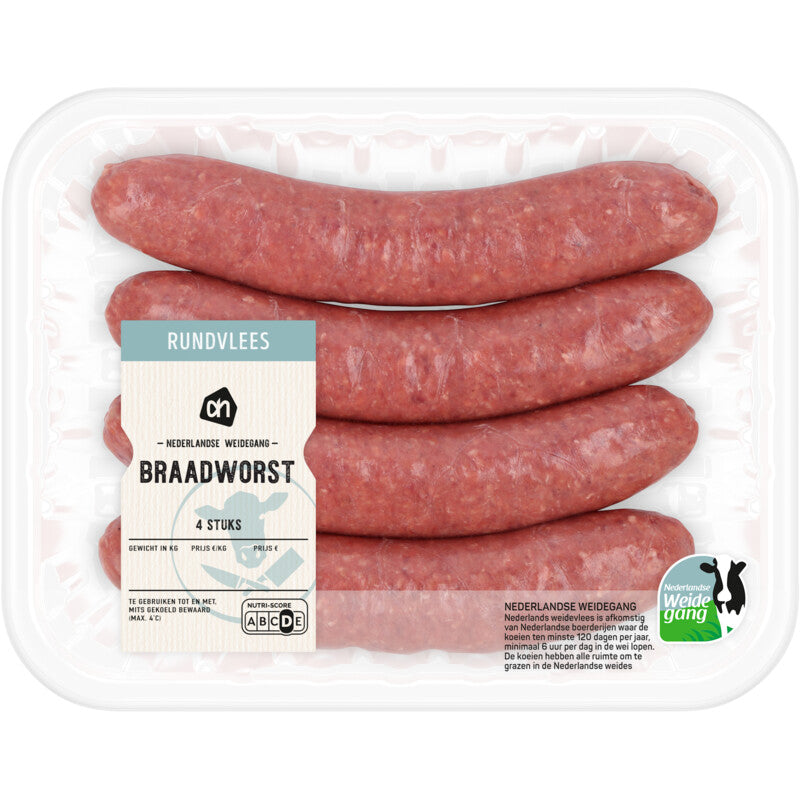 Saftige Rinderbratwurst, gewürzt mit einer leckeren Gewürzmischung, fertig zur Zubereitung. Probieren Sie es auf einem Sandwich mit Käse und Pfeffersauce, aber auch sehr lecker mit Grünkohl. * Rindfleisch mit niederländischer Weidehaltung * Zubereitung: Bratpfanne, ca. 13 Minuten. * Auch zum BBQ und Grillen geeignet * Tipp: Die Wurst nicht anstechen, so bleibt sie schön saftig
