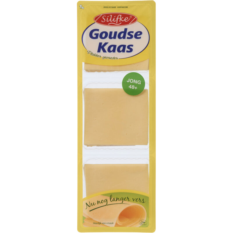 Jonge, goudse 48+ vegetarische kaas in plakjes gesneden, lekker op een sandwich en perfect geschikt om een smeuige tosti met gesmolten kaas te maken. Gemaakt van volle melk Gemaakt van vegetarische stremsel Volle romige smaak en halal