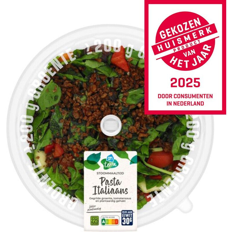Tomatensaus, eiwitrijke pasta, seitan gehakt, paprika, spinazie en gedroogde gemarineerde tomaat Door het stoomventiel worden de ingredienten gaar gestoomd in de magnetron Eiwitrijk