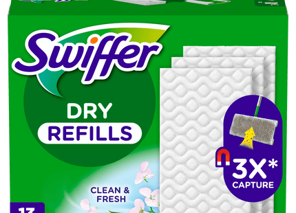 Swiffer droge vloerdoekjes Schoon & Fris dienen te worden gebruikt met de vloerreiniger om vuil, stof en haar op elk vloeroppervlak in je huis te vangen en vast te houden. 3x beter dan een gewone bezem en ze geven je vloeren een heerlijk frisse geur. Met de Swiffer Dry kun je je huis in een mum van tijd, moeiteloos en zonder geluid opnieuw instellen om schoon te maken. Het is perfect om fijn stof op te vangen in kleine hoekjes of moeilijk bereikbare plekken zoals onder de bank en het bed waar bezems en stofzuiger niet altijd kunnen komen. Dankzij de dikte en het specifieke patroon van de stofdoekjes en hun antistatische werking vangt en houdt het doekje al het stof vast, en zorgt voor een langdurige frisheid. Met de Swiffer droge vloerdoekjes gaat schoonmaken sneller en gemakkelijker dan ooit! Handige tips: ze zijn vooral ideaal om het haar van je huisdieren, dat constant uitvalt, te verwijderen of als je last hebt van een stofallergie. De Swiffer vloerdoekjes kunnen worden gebruikt op elk hard oppervlak, zoals al dan niet geboend linoleum, vinyl, keramische tegels en behandelde houten vloeren.