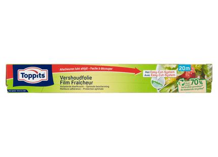 Plasticsoort: PE (polyethylene) Bevat 70% herbruikte grondstof* Ik ben... - Geproduceerd met gerecyclede grondstof - Recyclebaar Meer informatie over recycling en de toegepaste massabalans aanpak kunt u vinden op: www.toppits.nl/circular Bedankt om me te recycled! Save Food: Ik hou voeding langer vers en help daardoor voedselafval te vermijden! De voordelen op een rij: - Zelfklevende folie - Easy-Cut-System voor probleemloos afscheuren - Hygiënische klik-verpakking - Bredere folie - ideaal voor het afdekken in één keer - Geïntegreerde rolhouder - houdt de rol op zijn plaats - Met praktisch startpunt