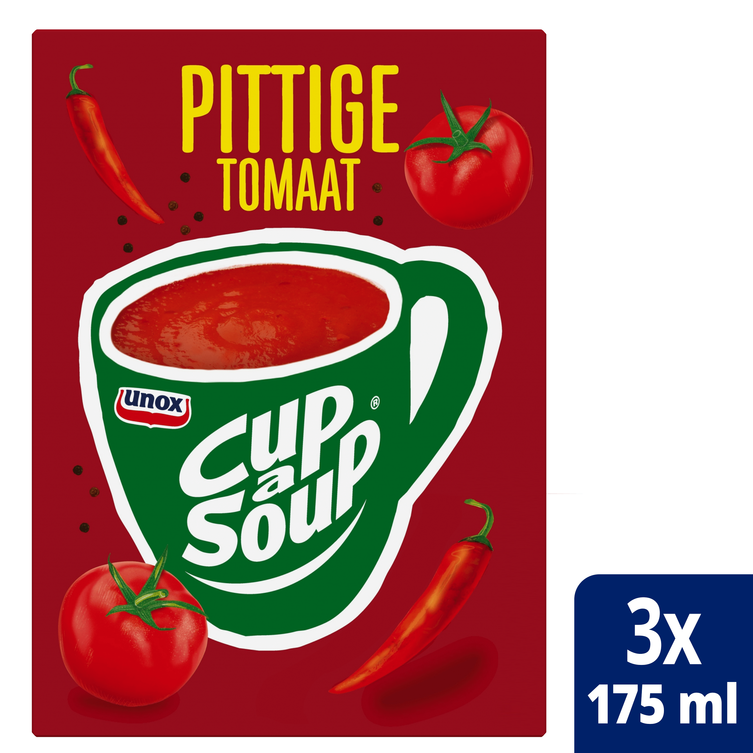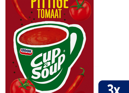 Unox Pittige Tomaat Cup-a-Soup is een snelle, hartige opkikker die je weer energie geeft om door te gaan! Een heerlijk volle tomatensoep met duurzaam geteelde tomaten. Heb je een drukke dag en zin in een snack om weer scherp en alert door te kunnen gaan? Of heb je gewoon zin in een lekker soepje? Thuis, op kantoor of waar je ook bent, Cup-a-Soup is altijd een heerlijk hartig tussendoortje. Lekker, makkelijk en snel! In een verpakking zitten 3 heerlijke zakjes Cup-a-Soup. Een zakje van deze heerlijke Unox Pittige Tomaat Cup-a-Soup bevat 50 calorieën per mok. Zoals je van ons gewend bent, besteden wij veel zorg en aandacht aan ons recept en gebruiken wij alleen de beste ingrediënten om de goede smaak te waarborgen. Daarnaast bevat deze soep geen kunstmatige kleurstoffen, toegevoegde smaakversterkers en conserveermiddelen. Deze variant is geschikt voor vegetariërs en veganisten. Cup-a-Soup: dat zouden meer mensen moeten doen!