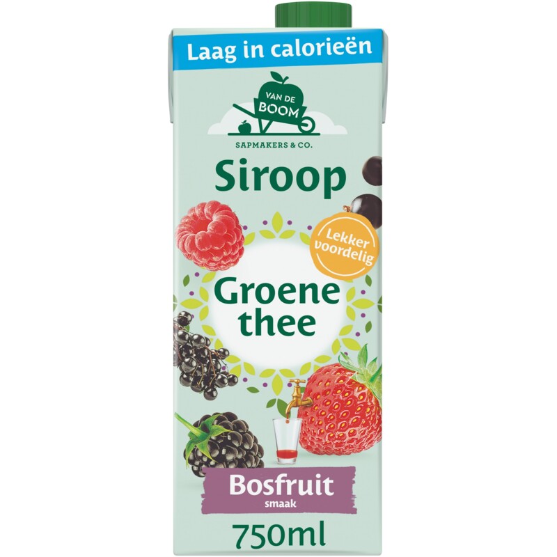 Van de Boom groene thee bosfruit siroop is een heerlijke mix van groen thee extract en bosfruit smaak. Vol van smaak, laag in calorieen! Een pak siroop is goed voor 30 glazen verfrissende limonade!Lekker voordelig: nieuw jasje, zelfde inhoud als blik (750ml), lage prijsLaag in calorieenSiroop om zelf aan te lengen, tot ca 30 glazen limonadeHeerlijke mix van groene thee-extract en citrus smaak