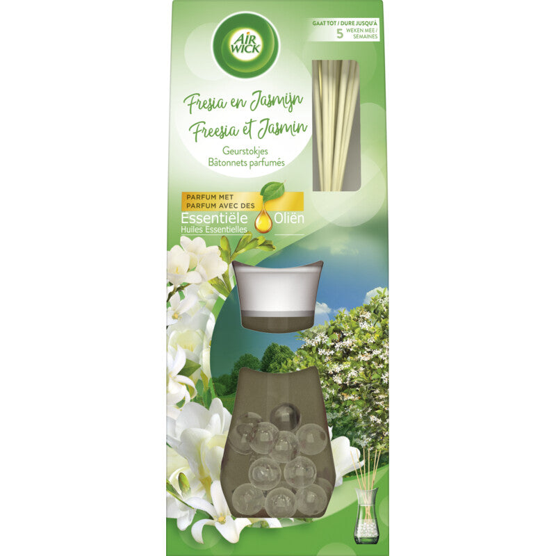 Dankzij het elegante parfum en design van Airwick geurstokjes hangt er een warme sfeer in je woning. Creeert een gastvrije sfeer in huis Natuurlijke rotanstokjes voor een subtiele geurverspreiding Gaat maximaal 5 weken mee Neutraliseert geurtjes en laat je woning fris ruiken Brengt het sprankelende aroma van verse fresia en jasmijn tot leven.