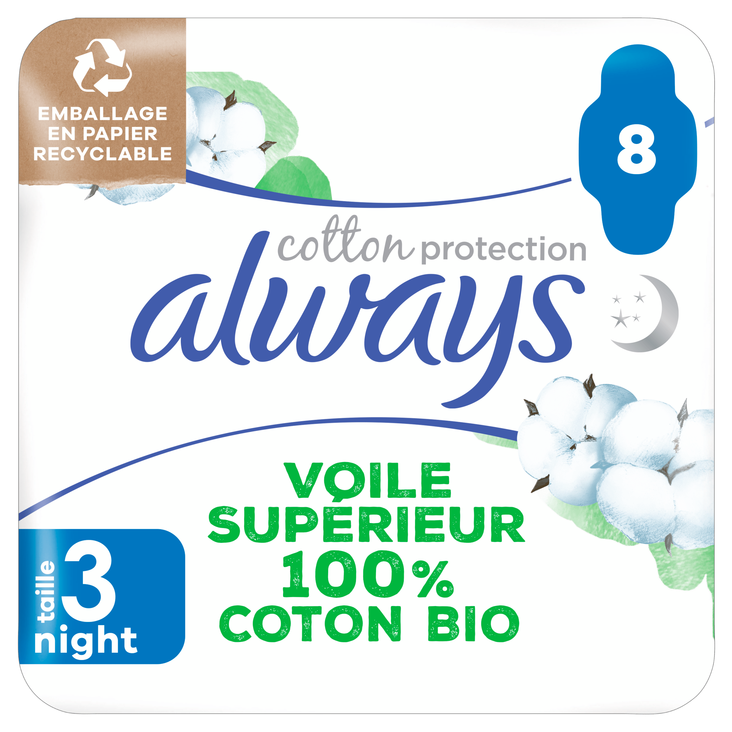 Always Always Cotton Protection maandverband zorgt voor jou en het milieu met een toplaag van 100% biologisch katoen in een recyclebare papieren verpakking. Het maandverband bevat geen parfum, geen kleurstoffen en geen chloorbleekmiddelen. Het maandverband is goedgekeurd door dermatologen van SHA (Skin Health Alliance) en gecertificeerd door Cotton Inc. Hun ultra absorberende kern zet vocht om in gel om je de vertrouwde Always bescherming te bieden Always Cotton Protection Night is ideaal voor een gemiddelde menstruatie met lingeriemaat L en voor een zware menstruatie met lingeriemaat M en L.