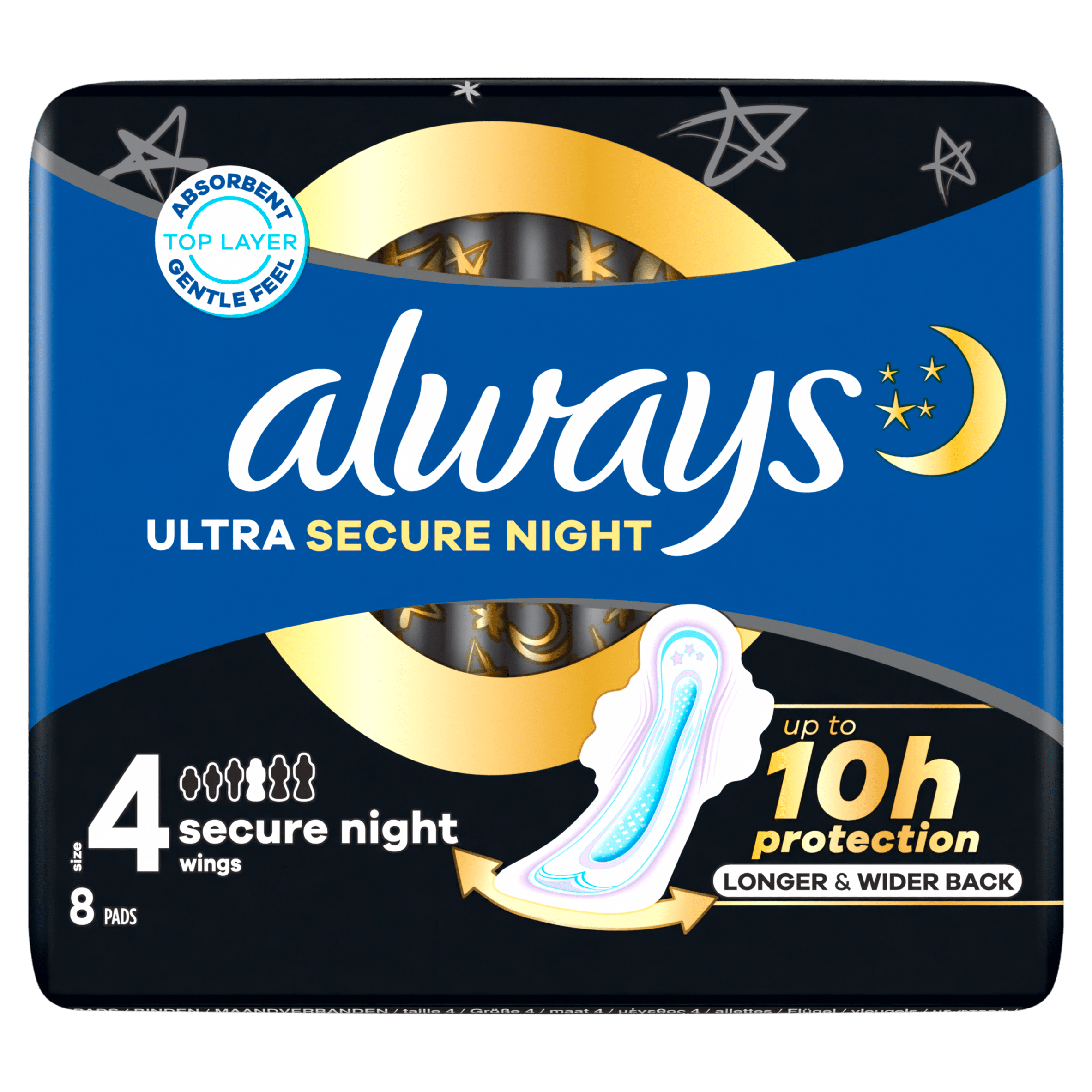 Geniet van een goede nachtrust en zeg ja tegen tot 10 uur lang bescherming: Always Ultra Secure Night maandverbanden (maat 4) met vleugels en een zacht aanvoelende absorberende toplaag hebben 3 beschermingskenmerken zodat je 's nachts niet hoeft op te staan om te controleren of je maandverband lekt of om het te vervangen. Een 60% grotere achterkant (in vergelijking met Always Ultra Normal maat 1) in combinatie met onze LeakGuard technologie helpt lekken en geurtjes 's nachts voorkomen. Always Ultra maandverbanden zijn goedgekeurd door de dermatologen van de Skin Health Alliance.