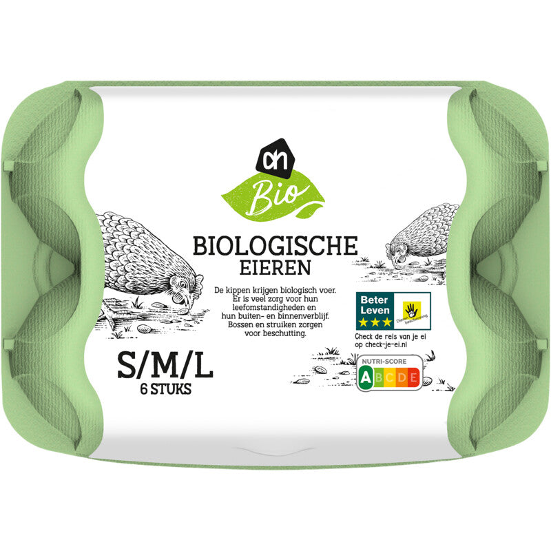 Biologische eieren met drie sterren van het Beter Leven Keurmerk. De kippen lopen lekker buiten en eten biologisch voer. In een volledig composteerbaar en biologisch afbreekbaar doosje. Neem het ervan en geniet van het lekkerste dat de natuur te bieden heeft. Van onze biologische producten kun je met een goed gevoel genieten dankzij de aandacht en inspanning van de boeren en producenten die ze voor ons maken. Natuurlijk worden al onze biologische producten onafhankelijk gecontroleerd en daarom verdienen ze het Europese keurmerk. Biologisch van Albert Heijn: dat smaakt naar meer! Met biologische eieren kies je echt voor diervriendelijkheid. De leefruimte van de kippen, vaak op kleinschalige boerenbedrijven, krijgt drie sterren van het Beter Leven Keurmerk. De kippen eten biologisch voer en hebben veel meer ruimte. Dit zijn de eieren waar je het goede boerenleven in proeft. Misschien viel de groene kleur van dit doosje je al op. Deze eierdoos is voor 50% gemaakt van gras en voor de rest van gecertificeerd duurzaam papier. Volledig composteerbaar en biologisch afbreekbaar. Verpakking met 6 biologische eieren klasse S/M/L. Beter Leven keurmerk 3 sterren. De biologische eieren worden gelegd door kippen die beschikking hebben over een buitenloop en worden gevoerd met biologisch voer. In geval van ophokplicht wegens vogelgriep hebben de leghennen, ter bescherming van hun eigen gezondheid, geen toegang tot de vrije uitloop.