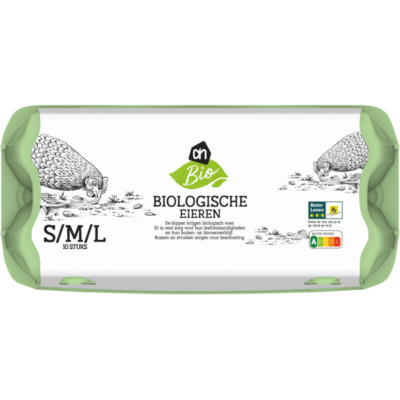 Biologische eieren met drie sterren van het Beter Leven Keurmerk. De kippen lopen lekker buiten en eten biologisch voer. In eierdoos die volledig composteerbaar en biologisch afbreekbaar is. Neem het ervan en geniet van het lekkerste dat de natuur te bieden heeft. Van onze biologische producten kun je met een goed gevoel genieten dankzij de aandacht en inspanning van de boeren en producenten die ze voor ons maken. Natuurlijk worden al onze biologische producten onafhankelijk gecontroleerd en daarom verdienen ze het Europese keurmerk. Biologisch van Albert Heijn: dat smaakt naar meer! Met biologische eieren kies je echt voor diervriendelijkheid. De leefruimte van de kippen, vaak op kleinschalige boerenbedrijven, krijgt drie sterren van het Beter Leven Keurmerk. De kippen eten biologisch voer en hebben veel meer ruimte. Dit zijn de eieren waar je het goede boerenleven in proeft. Misschien viel de groene kleur van dit doosje je al op. Deze eierdoos is voor 50% gemaakt van gras en voor de rest van gecertificeerd duurzaam papier. Volledig composteerbaar en biologisch afbreekbaar. Verpakking met 10 biologische eieren klasse S/M/L. Beter Leven keurmerk 3 sterren. De biologische eieren worden gelegd door kippen die beschikking hebben over een buitenloop en worden gevoed met biologisch voer....