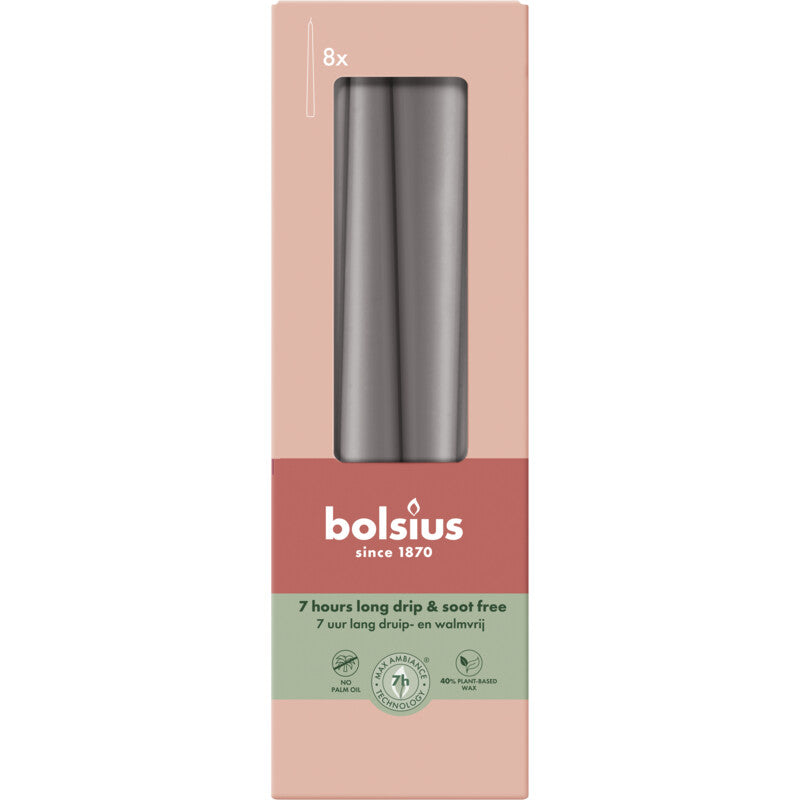 Gotische kaarsen 245/24 doos 8 stormy greyLek- en walm vrij dankzij onze maxambiance technologieZonder palmolie40% plantaardige waxPrachtige vlam