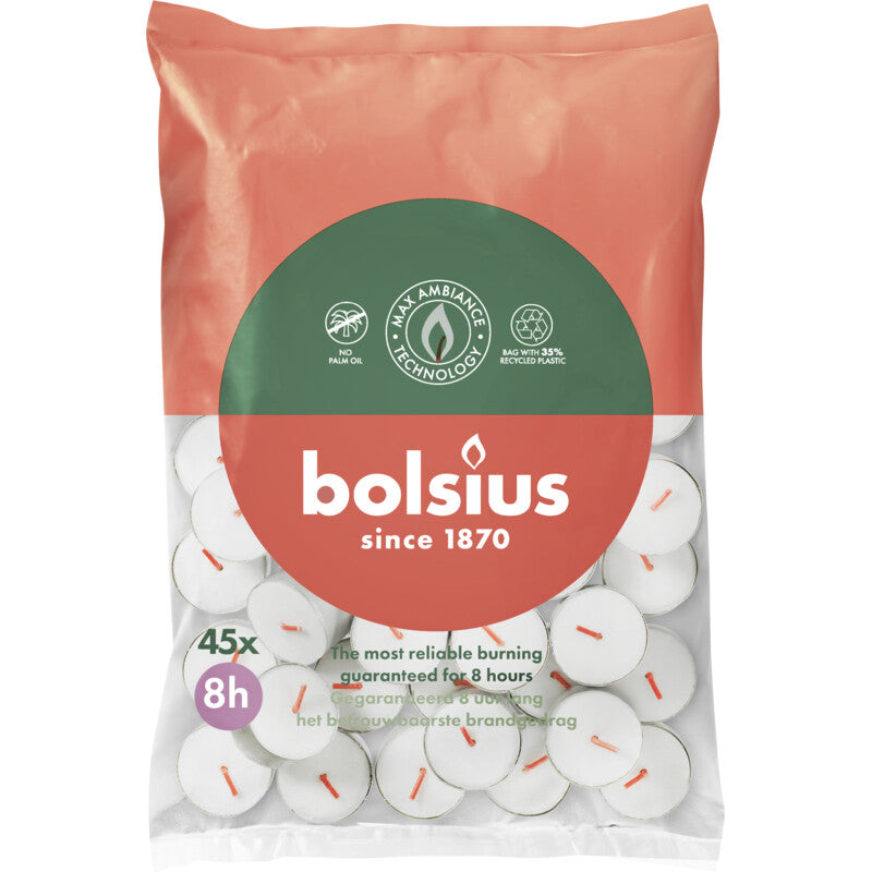 Bolsius - waxinelichtjes - in zak - 8 branduren - 45 stuks Gegarandeerd 8 uur lang het betrouwbaarste brandgedrag Zonder palmolie MaxAmbiance technologie Uitstekende kwaliteit Verhoog de sfeer in je huis met onze theelichten en voeg moeiteloos een vleugje magie toe. Onze superieure kwaliteit staat garant voor 8 uur lang het betrouwbaarste brandgedrag, dankzij de MaxAmbiance-technologie een unieke mix van de puurste wax en een speciaal gevlochten katoenen lont. Met liefde voor mens en planeet bevatten onze theelichten geen palmolie en gebruiken we 35% gerecycled plastic voor de verpakking. Naast het creëren van een rustgevende sfeer voegen ze een extra touch toe aan je tafel wanneer ze in een theelichthouder worden geplaatst.