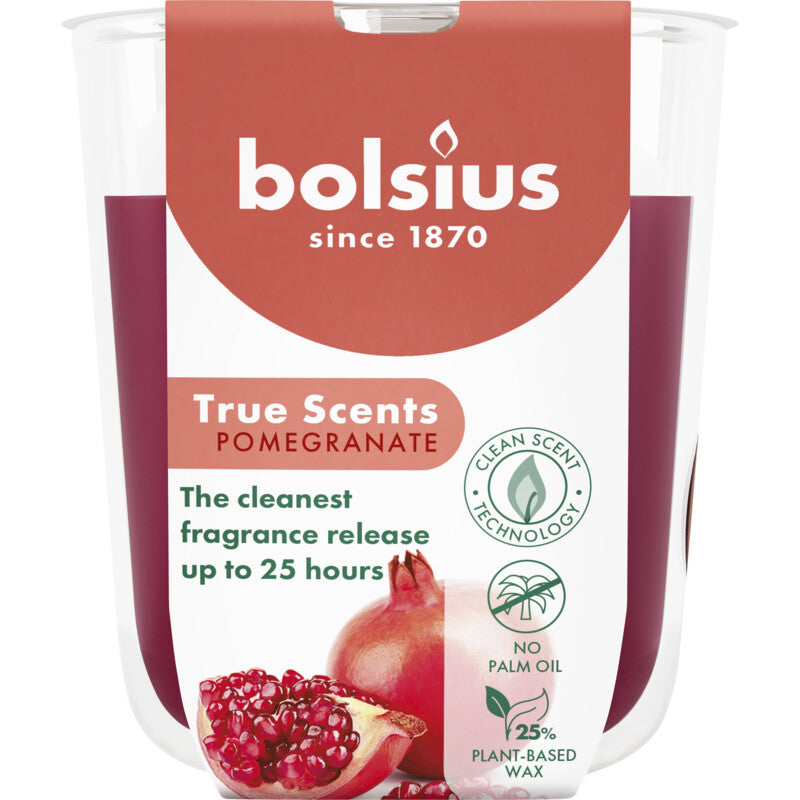 Bolsius True Scents - geurkaars in glas - Granaatappel - rood - klein De zuiverste geurafgifte tot 25 uur CleanScent technologie Zonder palmolie 25% plantaardige wax De rode Bolsius Granaatappel geurkaars in klein formaat zit in een helder glas en brandt tot wel 25 uur lang. Granaatappel is de geur van een echte fruitbom: zoet en sappig. Een vrolijk parfum waarmee je de zomer naar binnen brengt. Gemaakt met behulp van CleanScent technologie garanderen we de puurste geurervaring en de schoonste geurafgifte. Ervaar de pure geurbeleving van sappige granaatappel bij jou thuis.