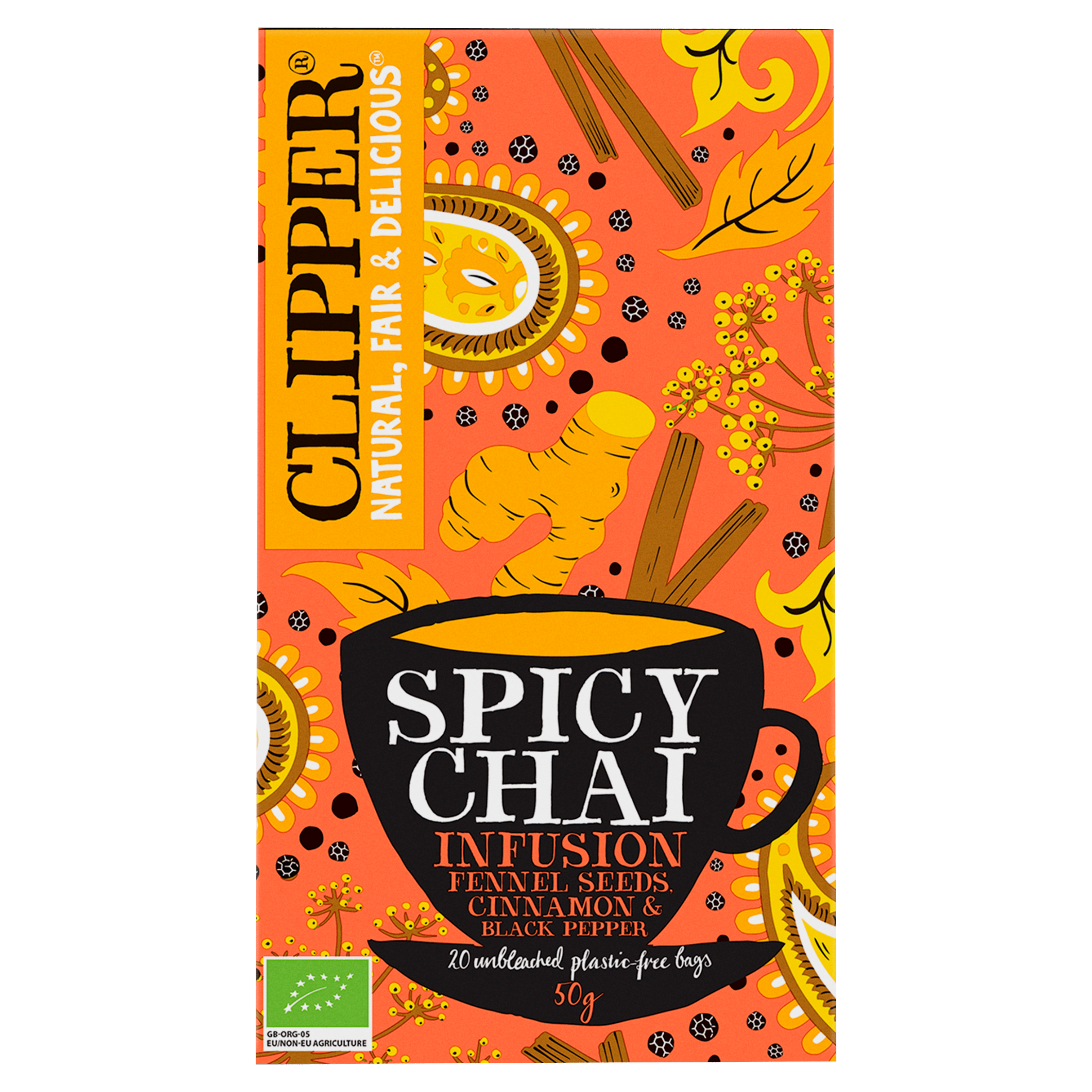 Ontdek de heerlijke Clipper Spicy Chai, een unieke kruideninfusie die je zintuigen prikkelt. Deze biologische mix combineert het natuurlijke zoet van venkel met de verwarmende smaken van kaneel en de pit van zwarte peper. Perfect voor een verkwikkend moment, deze chai is ideaal om je dag mee te beginnen of als een verwarmende traktatie in de avond.