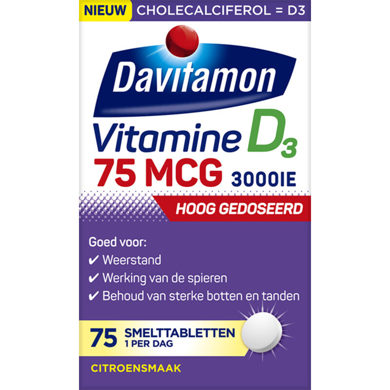 Davitamon vitamine d3 75 mcg: hoog gedoseerde smelttabletten voor volwassenen. Dit hoog gedoseerde voedingssupplement is voor tijdelijk gebruik ter aanvulling van voeding.GlutenvrijGeschikt voor vegetariersLactosevrijMet een lekkere frisse citroensmaak