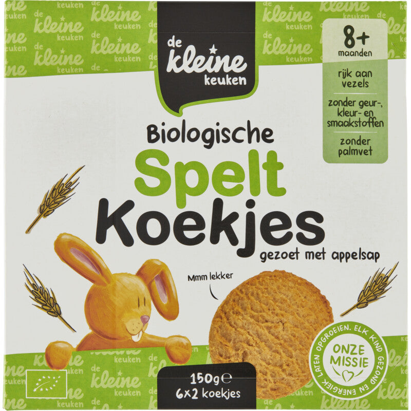 Koekjes gemaakt met lekker veel spelt en haver. Waardevolle granen waar je kleine echt iets aan heeft! Appelsap zorgt voor een klein zoetje, maar niet te veel. Een prima koekje voor kleine buikjes! Rijk aan vezels Zonder palmvet Zonder toegevoegde geur-, kleur- en smaakstoffen Rijk aan ijzer en koper Bij De Kleine Keuken willen we dat elk kind gezond en energiek opgroeit. Daarom zorgen wij voor superkracht in iedere hap. Al onze producten zijn biologisch en gemaakt van natuurlijke ingredienten. Bovendien bevatten ze nooit onnodige toevoegingen. Zo weet je zeker dat elk hapje boordevol voedingsstoffen zit, want daar worden kleine buikjes nou eenmaal erg blij van. En natuurlijk zijn ze lekker, want ook dat telt voor die kleine fijnproevers!