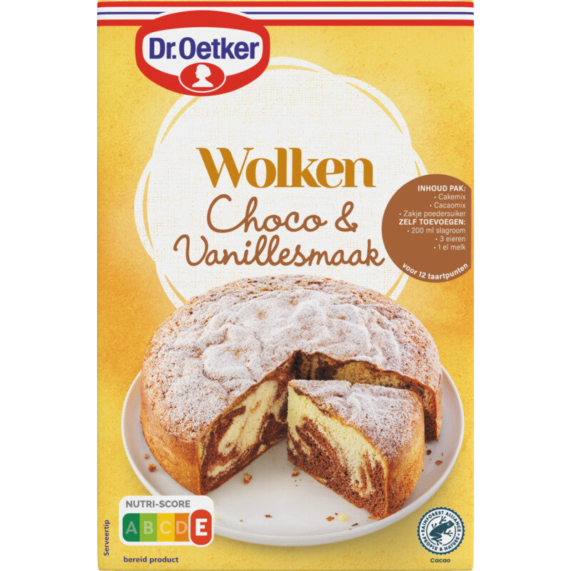Benodigdheden: 1 pak Dr. Oetker Wolken Choco & Vanillesmaak, 200ml slagroom, 3 eieren, 1 el melk. Keukengerei: Mixer met gardes, Beslagkom, Springvorm (Ø 24 cm), Zeefje, Bakpapier. Bereidingstijd: Bereiding: ±15 minuten. Baktijd: 50-55 minuten. Voor 12 taartpunten. Oventemperatuur: Eletrische Oven: 160°C, Hetelucht oven 140°C, Gas oven: stand 3. Elektrische oven aanbevolen. Voorbereiden (5 minuten): Plaats het rooster onderin de oven en verwarm de oven voor. Leg bakpapier op de springvormbodem, plaats de rand hierop en sluit de springvorm. Vet de randen in met boter of bakspray (bijv. Dr. Oetker). Beslag bereiden (10 minuten): Doe de cakemix, de eieren en de slagroom in een beslagkom en mix het geheel met een mixer op de laagste stand goed door elkaar. Klop het beslag daarna op de hoogste stand in 3 minuten luchtig. Verdeel de helft van het beslag over de springvorm en strijk het glad. Voeg de cacaomix en een eetlepel melk aan het overige beslag toe en klop het nog eens een halve minuut op de hoogste stand tot een egaal beslag. Verdeel het donkere beslag over het lichte beslag en roer met een vork zo door dat er een marmereffect ontstaat. Strooi circa ¼ van het zakje poedersuiker vlak voor het bakken met een zeefje over het beslag. Bakken (50-55 minuten): Bak de cake onderin de oven op een rooster (bij een combi- magnetron niet op de glasplaat) in 50-55 minuten gaar en goudbruin. Prik met een satéprikker in het midden van de cake. Als deze er droog en schoon uitkomt is de cake gaar. Laat de cake zonder springvormrand afkoelen op een rooster. Bestrooi de cake vlak voor het serveren met de rest van de poedersuiker,
