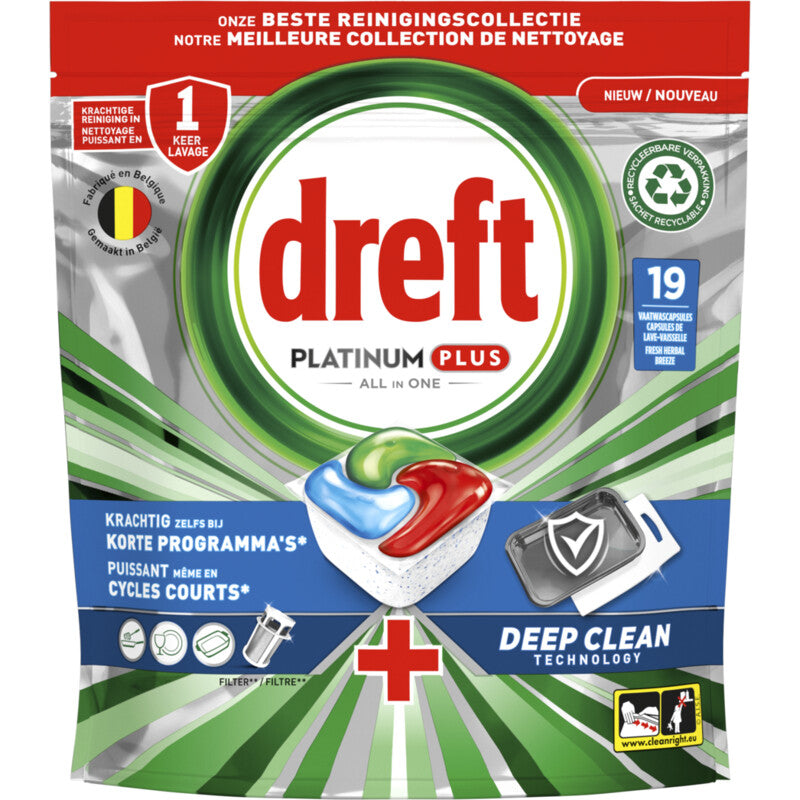 Dreft platinum plus all in One deep clean vaatwastabletten bieden je een uitzonderlijk schone vaat in slechts korte tijd. De beste tabletten van Dreft voor het reinigen van moeilijke etensresten Verwijdert 99% van de zichtbare en onzichtbare voedselresten Doeltreffend, zelfs in korte cycli Stap over op korte cycli in plaats van normale cycli Dreft platinum plus geeft je een uitmuntende reiniging en verwijdert hardnekkige voedselvlekken, zelfs in de testconditie van een korte cyclus. Dus als je weinig tijd hebt, dan is dat geen enkel probleem. Stap over op kort. Dreft combineert vloeistof en poeder in een krachtige tablet. Het ultra-oplosbare zakje lost snel op en werkt goed in korte cycli omdat het snel begint te reinigen om de klus klaar te krijgen. En ze zijn gemakkelijk te gebruiken. Plaats ze gewoon in het doseerbakje van je vaatwasser, met verpakking. Schakel over op de korte cyclus en bespaar tijd, energie en water in vergelijking met een gewone, standaard cyclus.