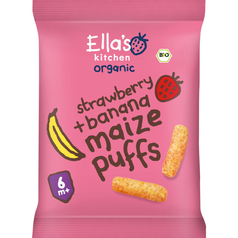 100% biologisch tussendoortje. Gepofte mais puffs met banaan + aardbei. De perfecte grootte + vorm om kleintjes te leren om hun eigen eten te pakken en smelt in kleine mondjes! Vanaf 6 maanden. 100% biologisch tussendoortje Zonder toegevoegde suikers (bevat alleen van nature aanwezige suikers) Perfect om kindjes zelf te laten eten Hersluitbare verpakking Bij ella s kitchen maken we 100% biologische baby voeding waar je baby of peuter dol op is. Van fruithapjes tot maaltijden, baby koekjes en tussendoortjes, met spannende smaken + texturen die de smaakpapillen van je kleintje laten tinkelen!