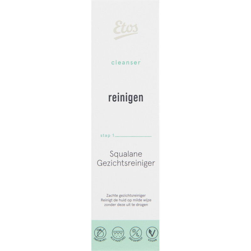 Etos Squalane is een zachte en grondige gezichtsreiniger. Deze fijne gezichtsreiniger droogt de huid niet uit en reinigt op een milde wijze. Geschikt voor alle huidtypen Kan ‘s morgens en/of ‘s avonds gebruikt worden Reinigen is stap 1 in je skin care routine Parfum- en Microplastic vrij