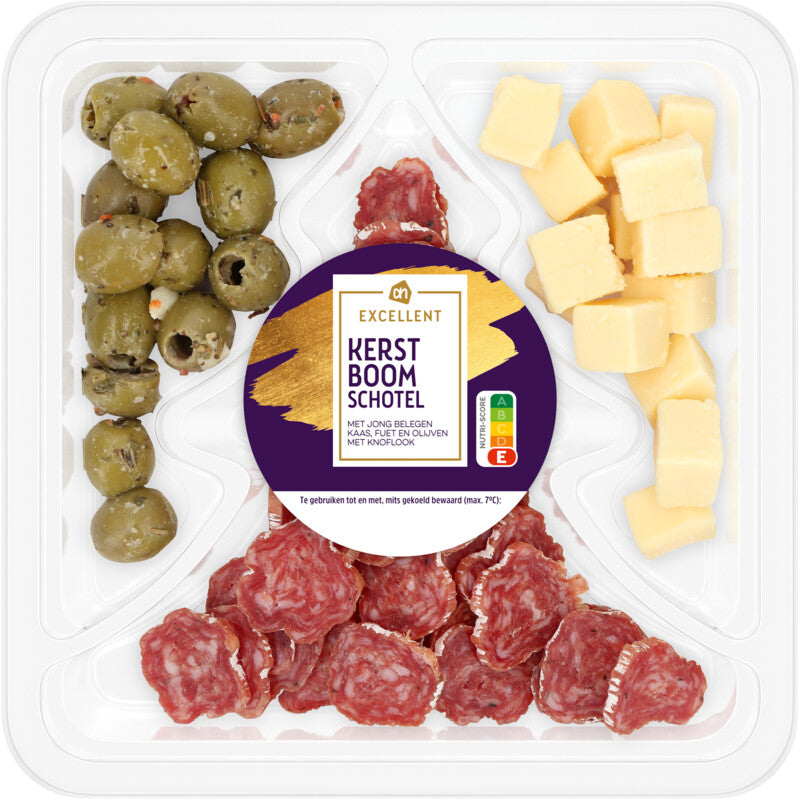 Een perfecte borrelschotel voor tijdens de feestdagen! Deze borrelschotel in de vorm van een kerstboom, maakt jouw borrelplank compleet! De borrelschotel is gevuld met Spaanse fuet, Goudse jong belegen kaas 48 +, en olijven met knoflook.