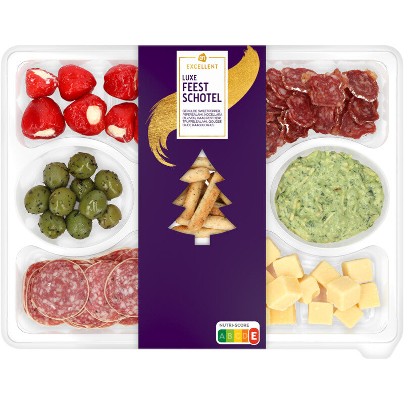 Ingrediënten: Sweetpepper roomkaas: [melk, 38% zoete peper, suiker, raapolie, azijn, zout, water, conserveermiddel (kaliumsorbaat [E202], natriumbenzoaat [E211], melkzuur [E270]), zuursel, microbieel stremsel, verdikkingsmiddel (xanthaangom [E415]), voedingszuur (citroenzuur [E330]), zuurteregelaar (calciumchloride [E509])]. Oude kaas 48+: [melk, zout, zuursel, microbieel stremsel]. Kaas-pestodip: [plantaardige olie (raap, zonnebloem [in wisselende verhoudingen]), melk, 10% roomkaas, 9,9% basilicum, spinazie, azijn, 5% pijnboompit, water, scharreleigeel, wittewijnazijn, knoflookgranulaat, suiker, zout, aardappelzetmeel, gemodificeerd maïszetmeel, zuursel, specerijen (o.a. mosterd), verdikkingsmiddel (xanthaangom [E415]), antioxidant (extracten van rozemarijn [E392]), microbieel stremsel, natuurlijk aroma, kleurstof (carotenen [E160a])]. Pepersalami: [varkensvlees, zout, mageremelkpoeder, lactose, peper, dextrose, aroma's, rundercollageen, antioxidant (natriumascorbaat [E301]), conserveermiddel (natriumnitriet [E250], kaliumnitraat [E252])]. Truffelsalami met Parmezaanse kaas: [varkensvlees, gejodeerd zout, 3% zwarte zomertruffel, melk, varkensgelatine, specerijen (o.a. mosterd), conserveermiddel (natriumnitriet [E250], kaliumsorbaat [E202], natriumacetaten [E262]), dextrose, natuurlijk aroma (mosterd), antioxidant (natriumascorbaat [E301]), zuursel, verdikkingsmiddel (xanthaangom [E415]), emulgator (mono- en diglyceriden van vetzuren, veresterd met citroenzuur [E472c]), zout, stremsel]. Nocellara olijven: [89% Nocellara-olijf, plantaardige olie (zonnebloem, raap [in wisselende verhoudingen]), water, zout, peper, zuurteregelaar (melkzuur [E270]), 0,2% rozemarijn, natuurlijk rozemarijnaroma, conserveermiddel (kaliumsorbaat [E202])]. Dipstokjes basilicum-knoflook: [tarwebloem, plantaardige olie (zonnebloem, olijf), zeezout, gist, 1% basilicum, 0,3% knoflook].