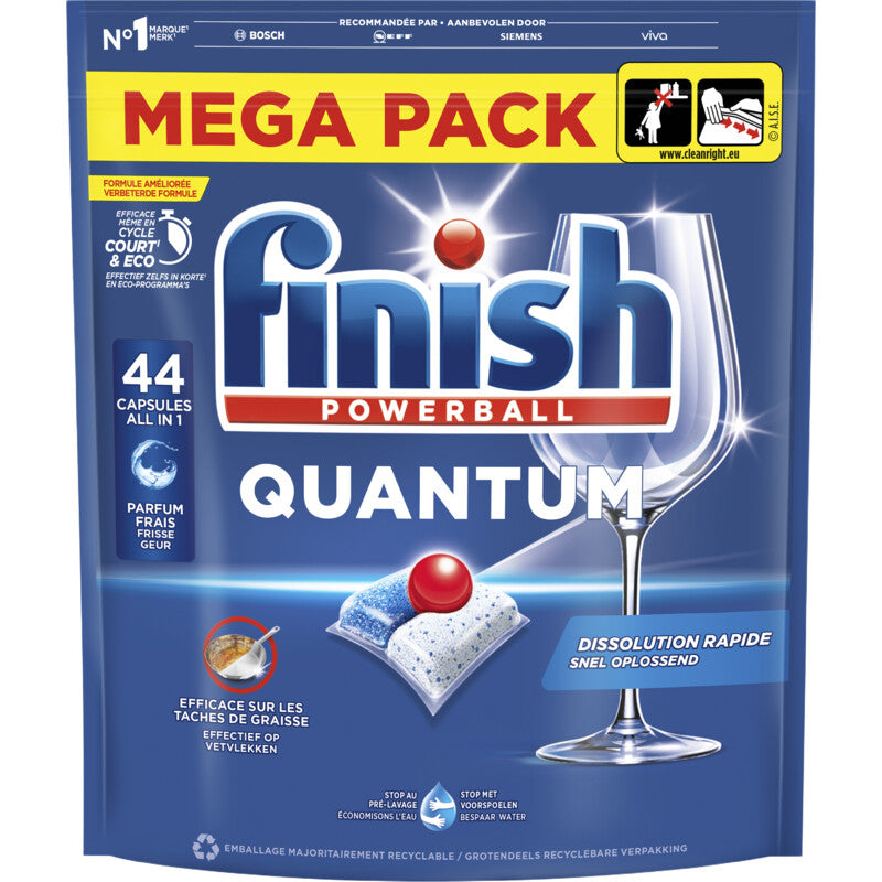 Met Finish quantum all in One vaatwascapsules krijg je bij elke wasbeurt vanaf de eerste keer een diepe reiniging en een stralende glans! Diepe reiniging: ontvet, reinigt en verwijdert hardnekkige vlekken Briljante glans: droogt je vaat en geeft een schitterende glans Geschikt voor korte cycli: snelle ontbinding van de capsule Finish zag het levenslicht in 1953 en is al meer dan zestig jaar gespecialiseerd in vaatwasmiddelen. Vandaag de dag zijn de producten van Finish verkrijgbaar in meer dan veertig landen over de hele wereld. Finish wordt aanbevolen door belangrijke fabrikanten van vaatwasmachines en servies. Finish is een merk dat zich inzet voor waterbesparing, Finish streeft ernaar om de ecologische impact van zijn producten en verpakkingen zoveel mogelijk te beperken.
