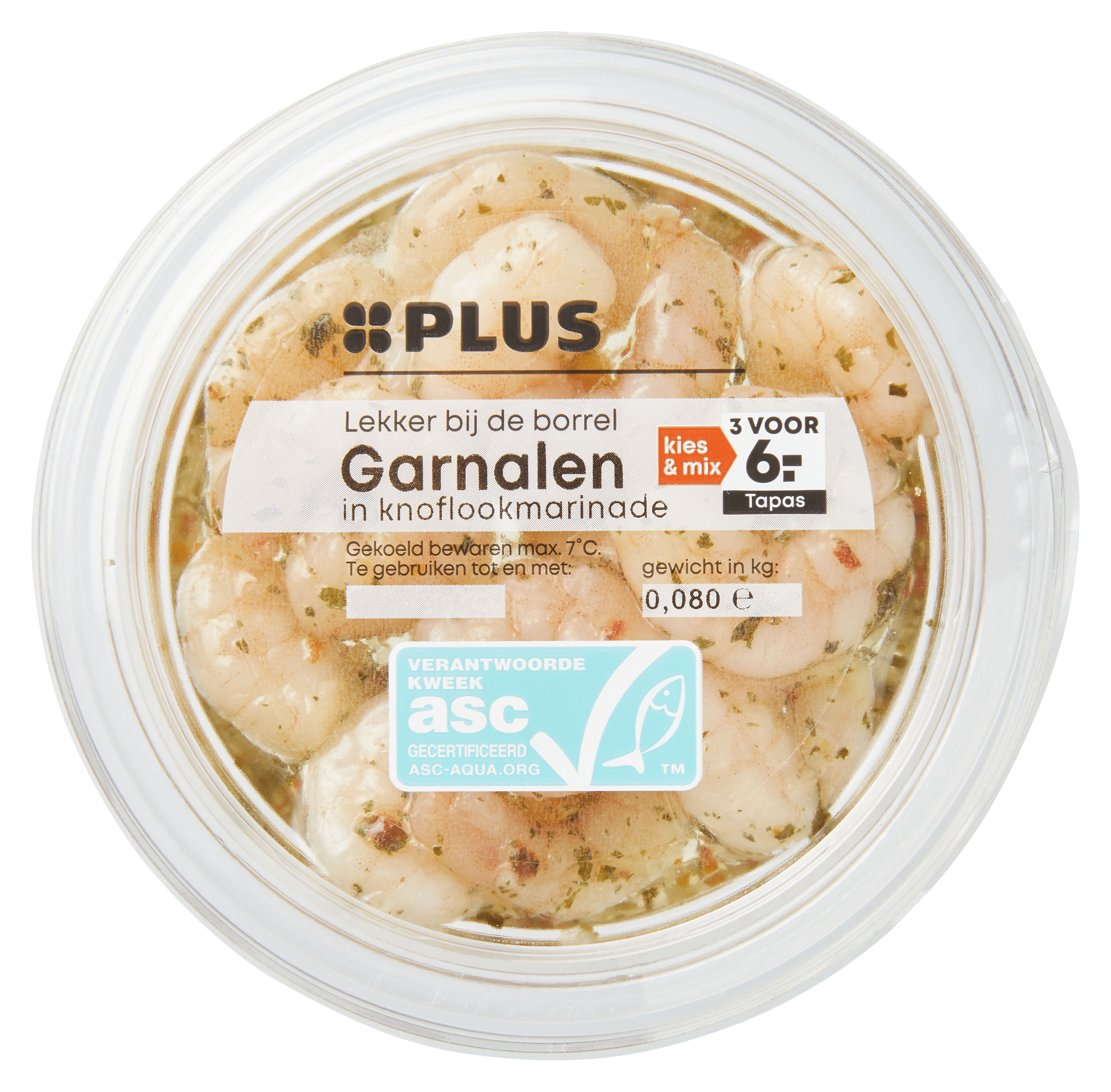 Ingrediënten :73% gekookte garnalen (97% garnalen (SCHAALDIEREN), zout, conserveermiddel: E260/E270/E262/E325/E210/E200, zuurteregelaar: E330, antioxidant: E223 (SULFIET)), 27% knoflookmarinade (raapzaadolie, water, 1.6% gedroogde knoflook, gedroogde paprika, gedroogde ui, peterselie, zout, conserveermiddel: E211/E210/E200/E260/E270/E325/E262, voedingszuur: E330/E296/E300).