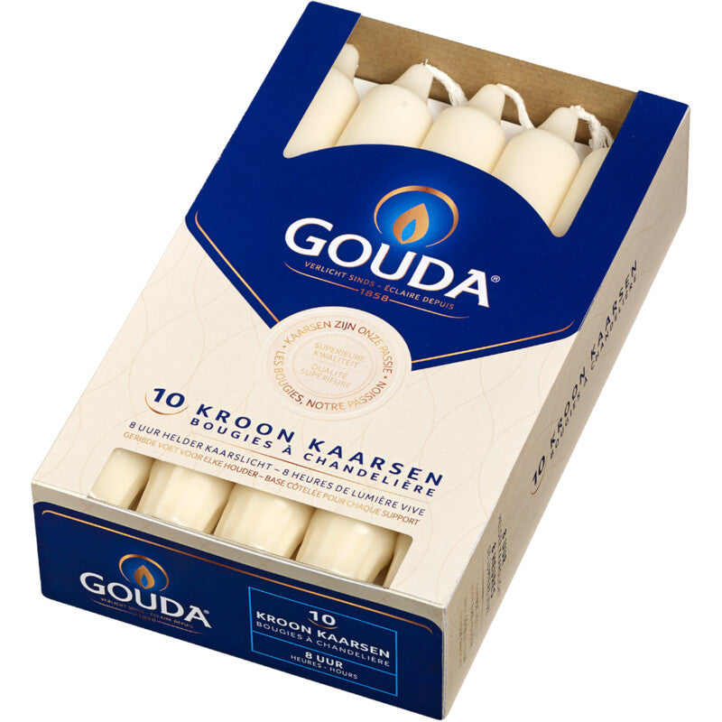 Gouda kroonkaars ds10 ivoor Kleur: ivoor Elegante kroonkaars van topkwaliteit Voorzien van speciale ribvoet, pasklaar voor diverse houders Gouda kaarsen staan garant voor zorgeloos genieten van sfeervol kaarslicht Gouda verlicht sinds 1858