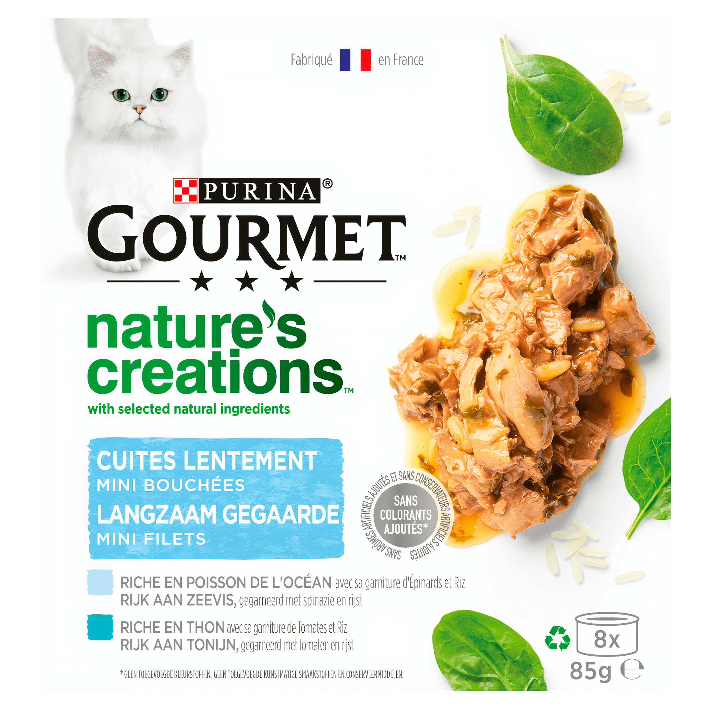 GOURMET™ Nature’s Creations is een collectie van heerlijke recepten geïnspireerd door de natuur. Deze recepten zijn zorgvuldig gemaakt met geselecteerde natuurlijke ingrediënten van hoge kwaliteit, op vakkundige wijze gekookt en rijk aan rund, lam, gevogelte of vis gegarneerd met groenten zoals spinazie, wortelen of tomaten en rijst. Elk uitstekend recept is gemaakt zodat uw fijnproever kan genieten van iedere hap. GOURMET™ Nature’s Creations. Heerlijke maaltijden, geïnspireerd door de natuur.