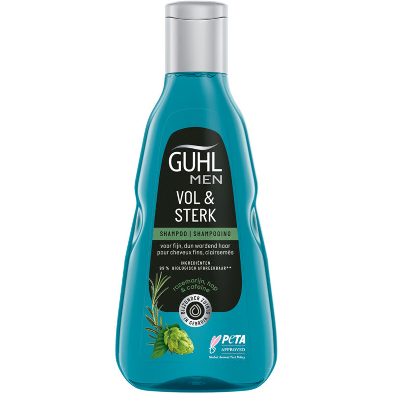 Guhl Man vol en sterk shampoo voor fijn, dun wordend haar, reinigt effectief en is mild voor de hoofdhuid. De shampoo versterkt voelbaar en zorgt voor merkbaar dikker en zichtbaar voller haar. Reinigt effectief en is mild voor de hoofdhuid Vitaliseert, activeert de hoofdhuid en versterkt de haarvezels Voor merkbaar dikker en zichtbaar voller haar Ingredienten: 92% van natuurlijke oorsprong tot 99% bio. Afbreekbaar Guhl Man vol en amp: sterk shampoo voor fijn, dun wordend haar, reinigt effectief en is mild voor de hoofdhuid. De shampoo versterkt voelbaar en zorgt voor merkbaar dikker en zichtbaar voller haar.De bijzonder zuinige formule, met vitaliserende rozemarijn, versterkende hop en activerende cafeine zorgt voor meer kracht en weerstand en geeft zichtbaar meer volume.Dermatologisch bevestigd. Zonder siliconen. Veganistische formulering: zonder ingredienten van dierlijke oorsprong. Recyclebaar: flacon voor 99% uit gerecycled materiaal. Ingredienten voor 92% van natuurlijke oorsprong en tot 99% biologisch afbreekbaar. inclusief water. Volgens oeso-richtlijnen en amp: incl. Water.De voordelen van Guhl Man vol en amp: sterk shampoo: voor fijn, dun wordend haar bevat rozemarijn, hop en cafeine reinigt effectief en is mild voor de hoofdhuid vitaliseert en activeert de hoofdhuid versterkt merkbaar de haarvezels voor merkbaar dikker en zichtbaar voller haar dermatologisch bevestigd - vrij van siliconen - veganistische formule ingredienten: 92% van natuurlijke oorsprong tot 99% biologisch afbreekbaar