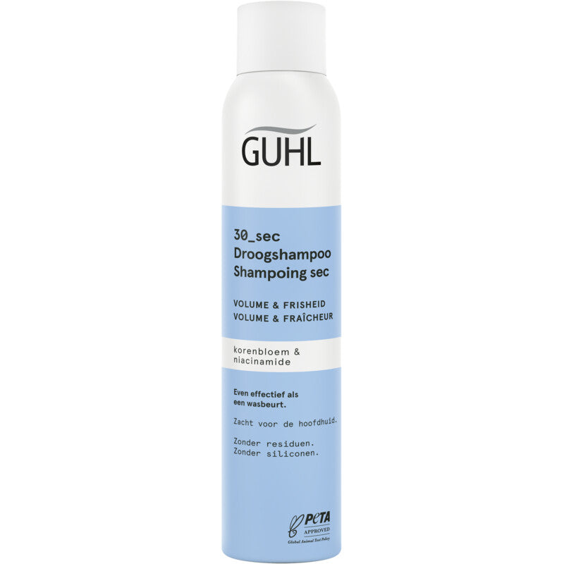 De Guhl 30 sec. Volume en frisheid droogshampoo bevat een uiterst effectieve reinigingsformule met korenbloem en niacinamide. De droogshampoo verfrist je haar zichtbaar in slechts 30 seconden. Onmiddelijk en langdurig verfrist haar, zonder witte residuen Vermindert vettig haar en reguleert overtollig talg Zorgt voor extra volumeboost en grip De Guhl 30 sec. Volume en frisheid droogshampoo bevat een uiterst effectieve reinigingsformule met korenbloem en niacinamide. De droogshampoo verfrist je haar zichtbaar in slechts 30 seconden en geeft je hoofdhuid rust tussen de wasbeurten door. dermatologisch bevestigd. Zonder siliconen. Veganistische formulering. Zonder ingredienten van dierlijke oorsprong. Verpakking recyclebaar. Waterbesparend. onmiddellijke en langdurige verfrissing vermindert vettig haar en zorgt voor licht haar zorgt voor een extra volumeboost en grip, ideaal als stijlverfrisser of stylingvoorbereiding zacht voor het microbioom van de hoofdhuid en droogt het haar niet uit met aquatische bloemengeur dermatologisch getest, vrij van siliconen, veganistische formule met natuurlijke extracten waterbesparend, moet niet worden uitgespoeld