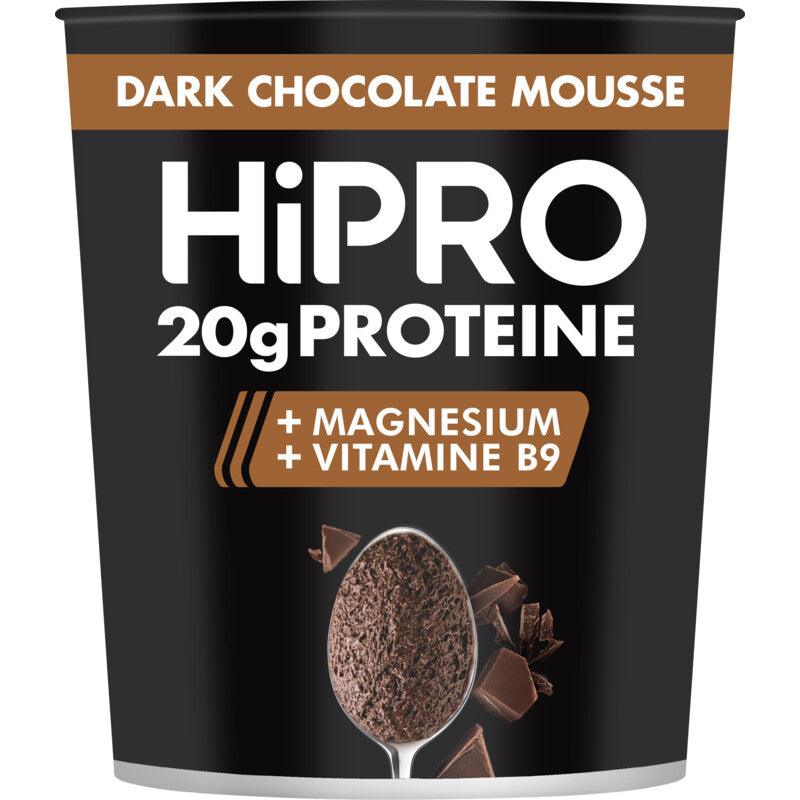 Hipro chocolate mousse is een heerlijke eiwitrijke mousse van danone. Geniet van deze luchtige chocolade mousse met pure chocolade smaak. Lekker verantwoord genieten als tussendoortje of als toetje. High protein met 20 gram eiwit per cup Zonder toegevoegde suikers en laag in vet Heerlijk als verantwoord dessert Een bron van magnesium Hipro protein mousse is een lekkere luchtige chocolademousse die ook nog eens hoog in proteine is. Naast 20 gram eiwit, is de mousse laag in vet en zijn er geen suikers toegevoegd. Ideaal om verantwoord van te genieten als toetje, tussendoortje of na het sporten. Hipro support je jouw doelen te behalen, hoe groot of klein die ook zijn. Met producten die rijk zijn aan eiwitten, zonder vet en geen suikers toegevoegd. En altijd ontzettend lekker. Meer van wat je nodig hebt en minder van wat je niet wilt hebben. Ideaal voor na het sporten of als lekker eiwitrijk tussendoortje. Behaal je eigen level up met hipro!