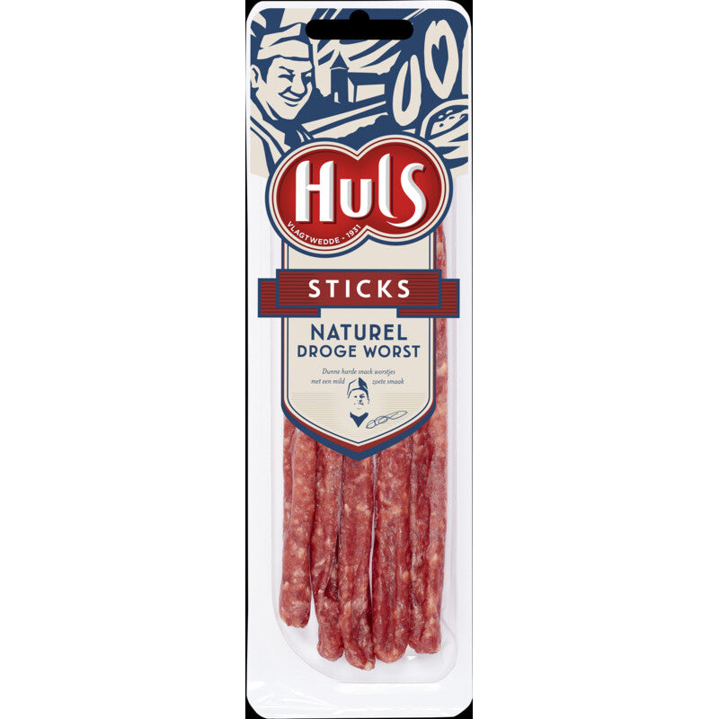 Huls sticks zijn stevige worststicks, traditioneel bereid van varkensvlees, met daaraan toegevoegd een heerlijk mengsel van verschillende kruiden. Lekker en snel als tussendoortje, snack of bij de borrel Makkelijk om uit te delen Stevige bite